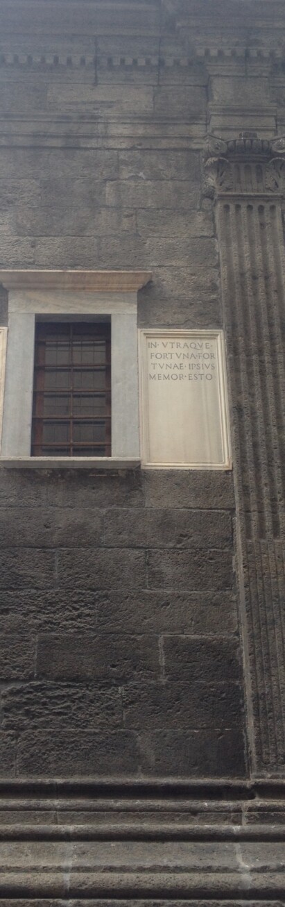 Auswuchs von Santa Maria Maggiore alla Pietrasanta. Schräg gegenüber seinem Wohnhaus lässt Giovanni Gioviano Pontano die Kapelle errichten, als Grablege für seine Frau, die er täglich besuchen wird. Nach und nach werden seine Kinder hineingelegt, seine Freunde, schließlich er selbst. 1490 beginnt der Bau, 1492 ist er vollendet, 1494 wird er geweiht. In der Zwischenzeit brechen mehrere Welten zusammen, ob durch ihre Entdeckung oder nicht. Der Tempel strahlt sein ruhiges Gleichmaß aus Vertrauen und Genussfähigkeit auf das Gewusel im Suq von Neapel. Via dei Tribunali Ecke via del Sole, Kreuzung von Sonne und Gericht. Auf der Außenhaut der Kapelle Inschriften, die die Wand in schmale Seiten gliedern. Pompeo Sarnelli schreibt in seinem Reiseführer über die Sehenswürdigkeiten Neapels 1685, man könnte die Kapelle als un libretto co’ fogli di marmo scritto di dentro e di fuori in versi ed in prosa bezeichnen, als ein Büchlein mit marmornen Seiten, die innen und außen mit Versen und Prosa vollgeschrieben sind. Ein Dichter will ein Haus bauen und es wird doch ein Buch. Die Kapelle hat außen, um genau zu sein, ein Dutzend Seiten. Es sind gute, brauchbare Sätze, die da stehen. Besonders dieser reißt sich mir ins Auge: In utraque fortuna fortunae ipsius memor esto. Egal, wie dir die Fortuna mitspielt, ob sie dich erhebt oder erniedrigt, denke daran, dass es stets die Fortuna ist. Ich glaube nicht, dass das in erster Linie ein Satz des Trostes ist für jene, die unter das Rad gekommen sind.